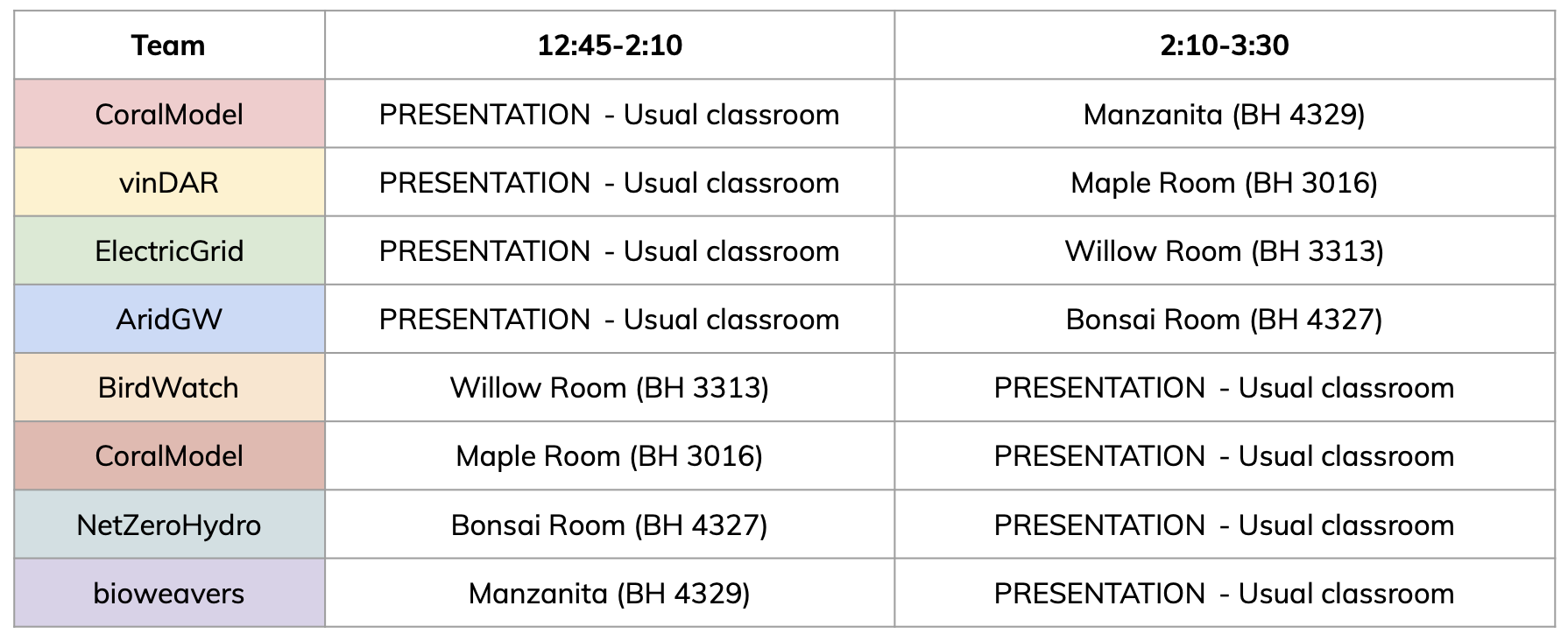 Your theam should work on their project outside of their โpresentation blockโ. The following rooms are reserved for you so you have a dedicated workspace during our usual class time. Youโre welcome to use other places to work.